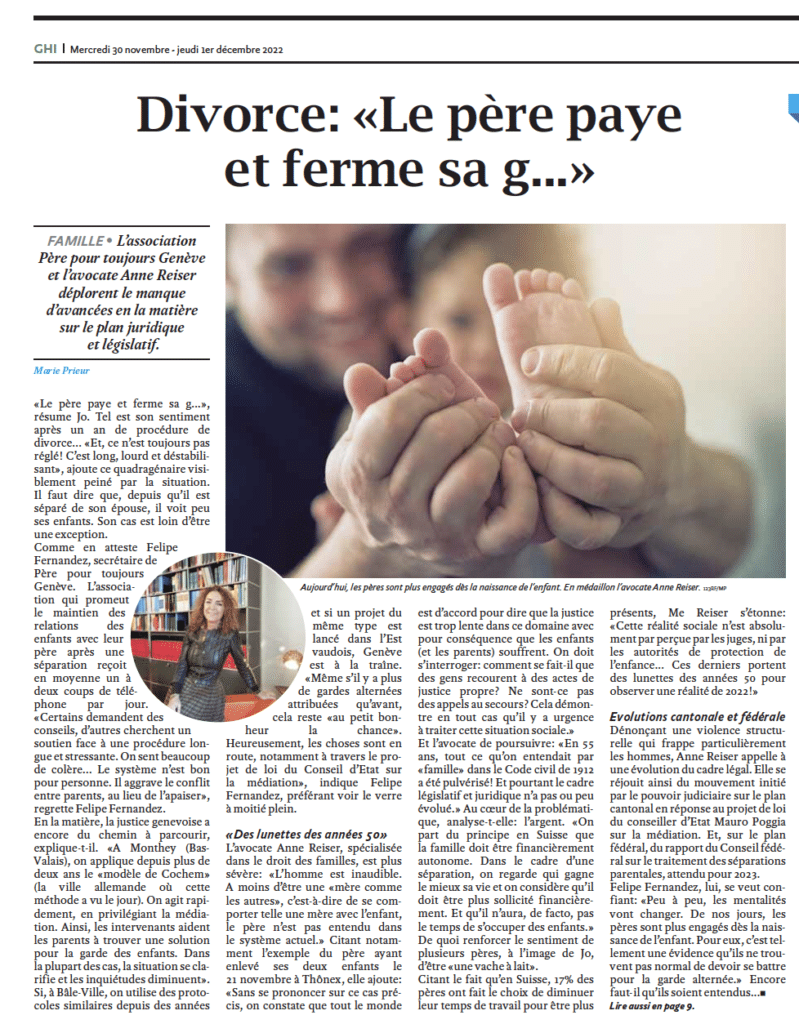 Dénonçant une violence structurelle qui frappe particulièrement les hommes, Anne Reiser appelle à une évolution du cadre légal. Elle se réjouit ainsi du mouvement initié par le pouvoir judiciaire sur le plan cantonal en réponse au projet de loi du conseiller d’Etat Mauro Poggia sur la médiation. Et, sur le plan fédéral, du rapport du Conseil fédéral sur le traitement des séparations parentales, attendu pour 2023.