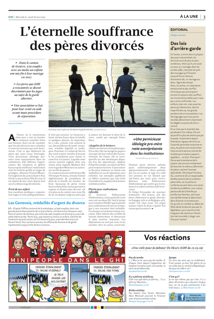 « Notre société est schizophrénique. D’un côté, elle encourage les papas à s’occuper de leur enfant dès l’accouchement. De l’autre, elle se recroqueville sur des stéréotypes dépassés lors des séparations », déplore Felipe Fernandez, secrétaire de « Père Pour Toujours Genève ». L’association se bat pour instaurer en Suisse une médiation en cas de séparation avec enfant(s). Les exemples québécois ou bâlois montrent que cela évite l’escalade et le « supplice de la lenteur institutionnelle».